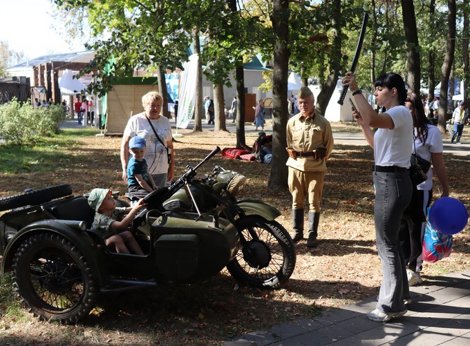 В парке под развлечения и увлечения был отдан буквально каждый свободный от деревьев уголок. По мысли организаторов, гости праздника должны были совершить путешествие через эпохи, начиная со Средневековья и заканчивая нашими днями. И этот приём удался. За внимание гостей соперничали рыцари в доспехах, обучающие азам фехтования, славные связисты времен ВОВ, очаровательные дамы в шляпках, играющие в старинные карточные игры, мастерицы в сарафанах, у которых можно было соткать часть ковра, медики всех времён и народов, от чумного доктора до современных санитаров.