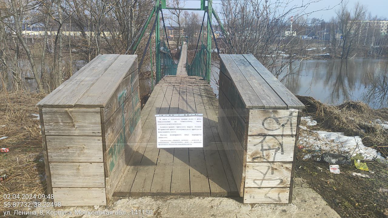 В связи с подъемом уровня воды в реке Воря, администрация городского округа Лосино-Петровский просит воздержаться от прохода по пешеходным мостам в д. Кармолино и д.