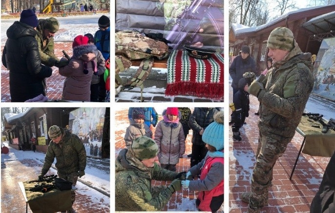 Алексей рассказал ребятам об основах начальной военной подготовки. Показал и разрешил попробовать каждому желающему разборку муляжа пистолета, прицела, прибора ночного видения, военного кортика, кинжала.