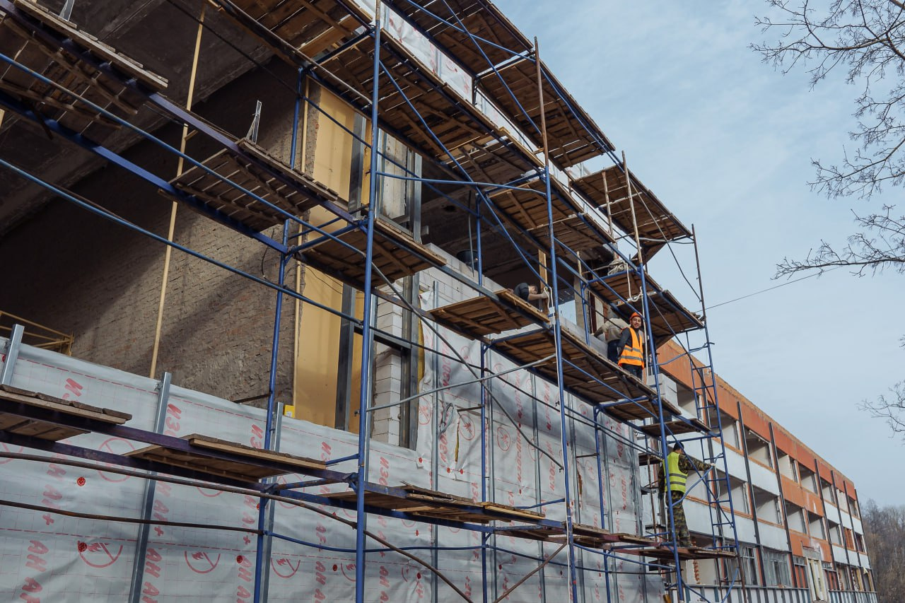 Сейчас идёт прокладка новых инженерных систем, укрепление фасадов, особенно это актуально для детского сада, где на стенах при демонтаже вскрылись болевые точки — стены затрещали.