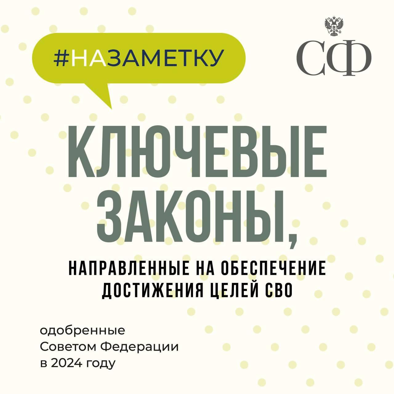 В 2024 году Совет Федерации одобрил ряд ключевых законов, направленных на поддержку участников, ветеранов СВО и их семей, а также защиту государственных границ Российской Федерации.
