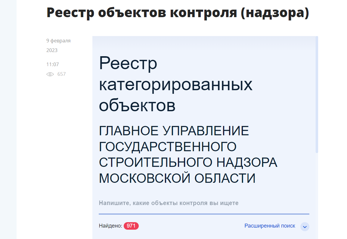 На официальном сайте Главгосстройнадзора Московской области встроен виджет Единого реестра видов контроля (ЕРВК), который аккумулирует реестр категорированных объектов по направлениям деятельности ведомства.