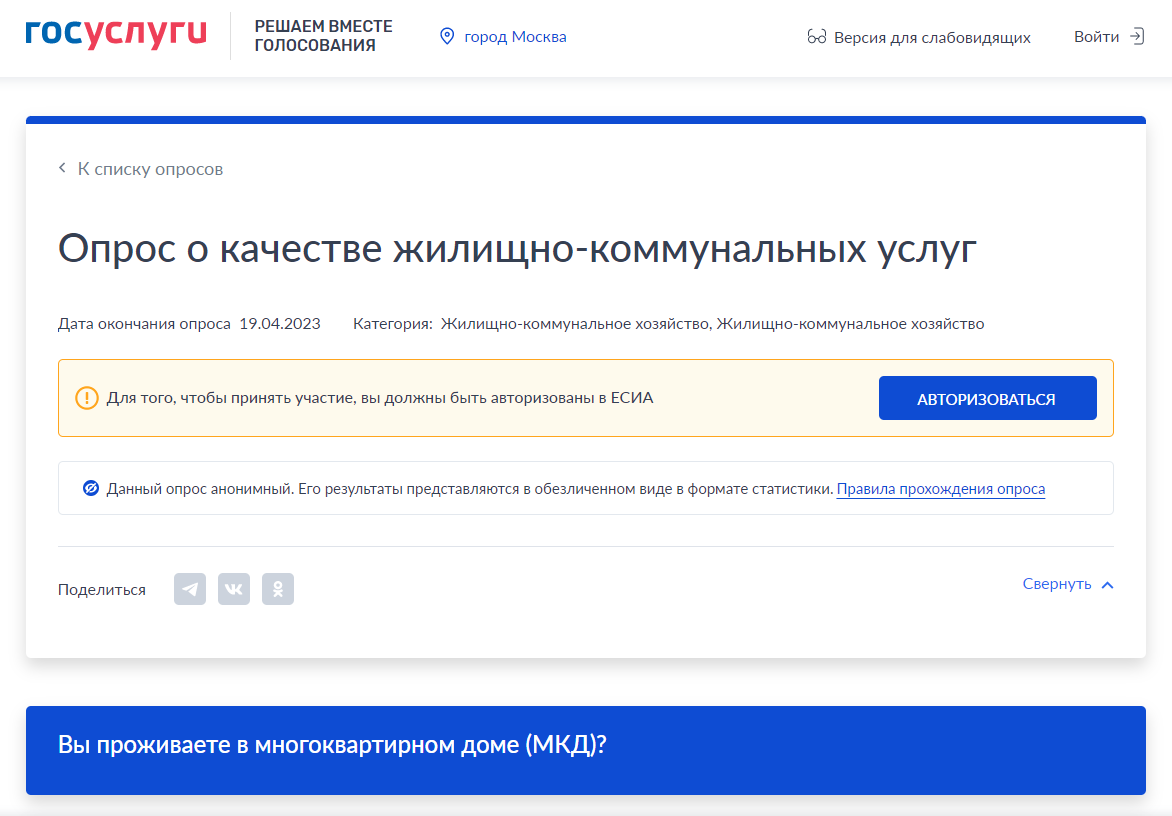 Министерство строительства и жилищно-коммунального хозяйства Российской Федерации в рамках проводимой работы по модернизации государственной информационной системы жилищно-коммунального хозяйства проводит с 12 апреля 2023 г. по 19 апреля 2023 г. онлайн опрос среди граждан Российской Федерации «О качестве жилищно-коммунальных услуг» .