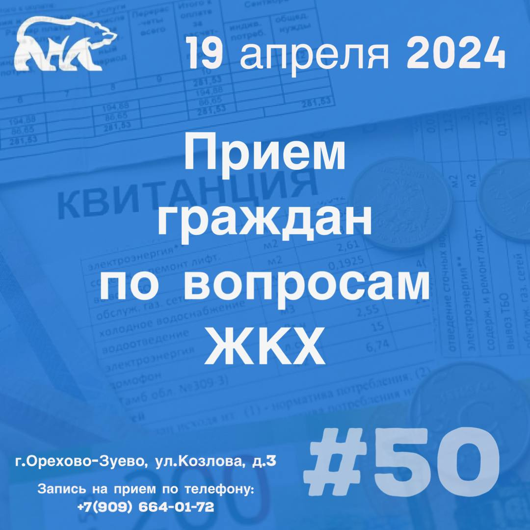 19 апреля с 10:00 до 11:00 пройдёт прием граждан по вопросам Жилищно-Коммунального Хозяйства в рамках Недели приемов граждан по адресу г. Орехово-Зуево, ул. Козлова, д.3