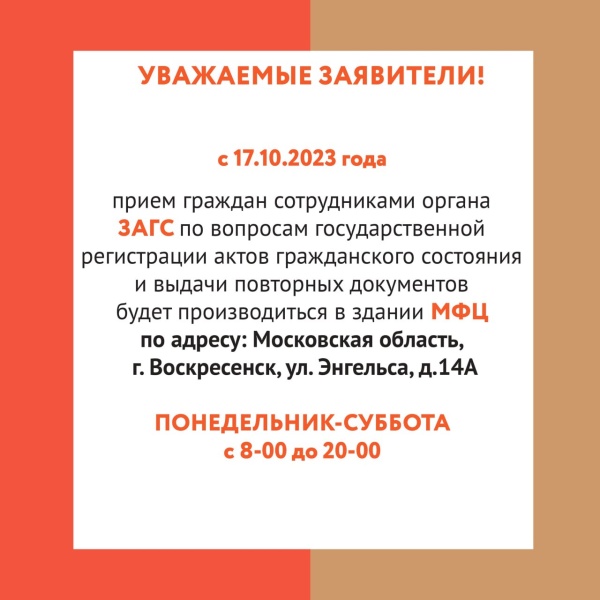 С 17 октября прием граждан сотрудниками органа ЗАГС по вопросам государственной регистрации актов гражданского состояния и выдачи повторных документов будет производиться в здании МФЦ по адресу: Московская область, г. Воскресенск, ул. Энгельса, д. 14а.