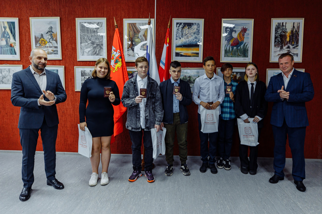 Перед встречей с жителями в рамках выездной администрации глава округа Руслан Заголовацкий вместе с депутатом Московской областной Думы Максимом Коркиным, членами политсовета местного отделения партии «Единая Россия», вручили паспорта молодым людям.