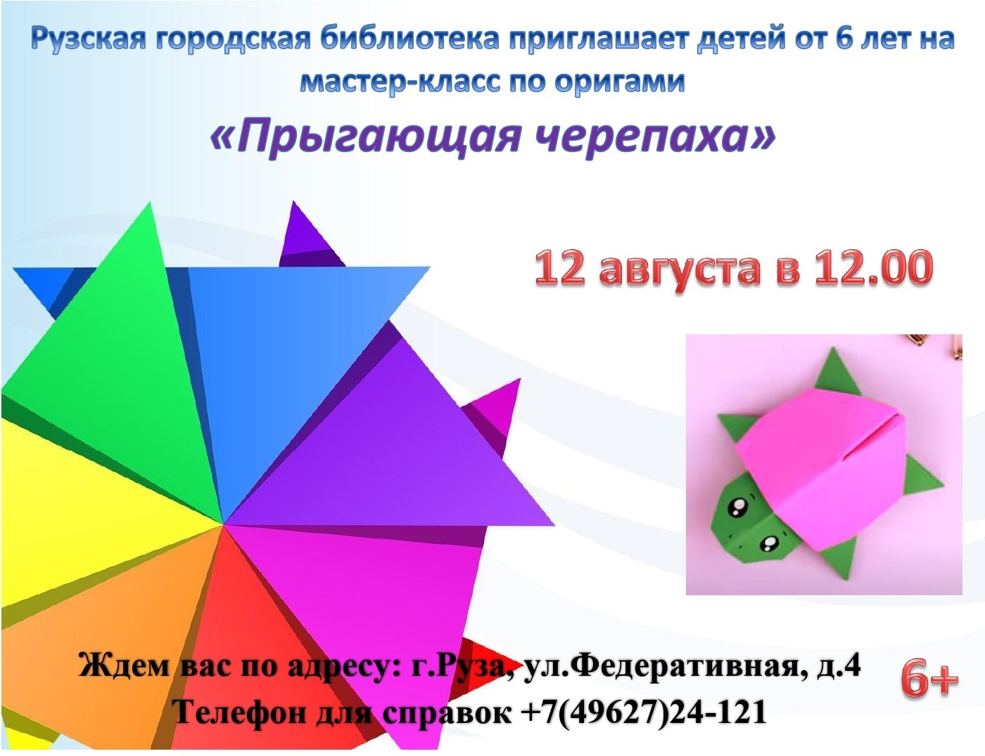 Рузская городская библиотека приглашает детей от 6 лет на мастер-класс в технике оригами «Прыгающая черепаха» в рамках библиомикса « Волшебный квадратик» , который состоится 12 августа в 12 часов.