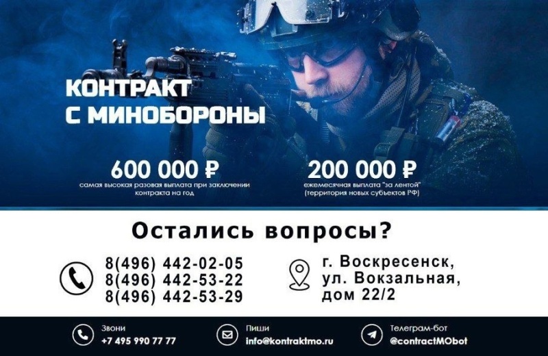 Если вы готовы присоединиться к миссии, подпишите контракт на военную службу. Заявка на оформление контракта подаётся в военном комиссариате города Воскресенска по адресу: ул. Вокзальная, д.22/2 или по телефонам: 8(496) 442-02-05, 8(496) 442-53-22, 8(496) 442-53-29. Все подробности о службе по контракту можно узнать на сайте контрактмо.рф или по телефону региональной горячей линии 117 и телефону пункта подготовки контрактников 8(495) 990-77-77.