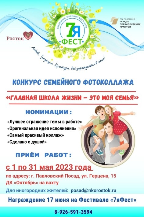 В Павловском Посаде дан старт традиционному конкурсу Семейного коллажа, который традиционно проходит в рамках Ежегодного семейного фестиваля «7Яфест». В этом году темой для работ стала «Главная школа жизни — это моя семья!».
