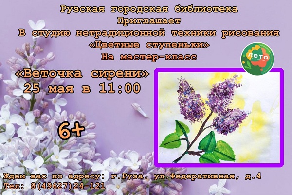 Мастер-класс «Веточка сирени» состоится 25 мая в 11 часов в студии нетрадиционной техники рисования «Цветные ступеньки» Рузской городской библиотеки.