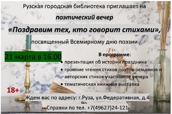 В Рузской городской библиотеке 21 марта для участников губернаторской программы «Активное долголетие» состоится поэтический вечер «Поздравим тех, кто говорит стихами», приуроченный ко Всемирному дню поэзии. Начало в 16 часов.