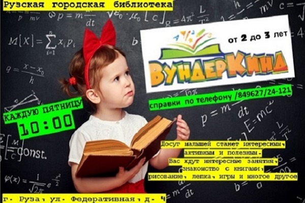 20 октября в 10 часов в семейном клубе «Вундеркинд» Рузской городской библиотеки состоятся комплексное развивающее занятие для интересного и активного времяпровождения малышей и игровая программа. Приглашаются родители с детьми 2-3 лет.