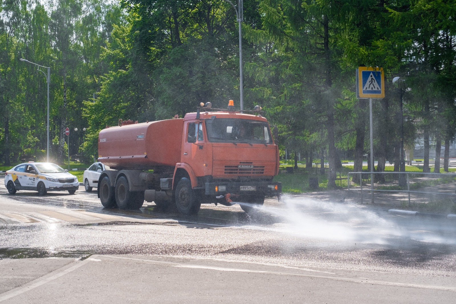 В жаркие летние дни на улицах города проводится аэрация воздуха, влажная уборка дорожной сети.