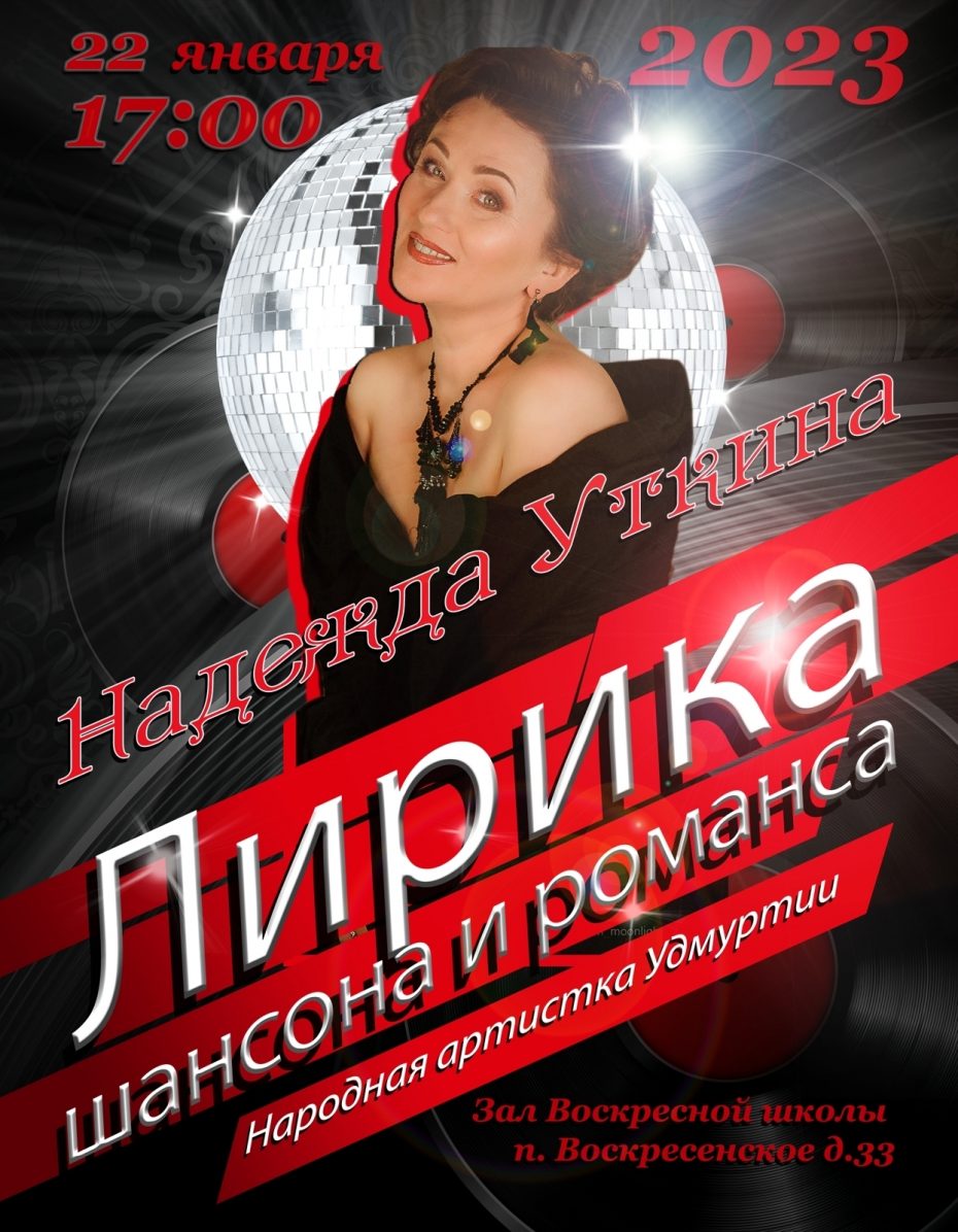 Представители Воскресной школы имени Цесаревича Алексия поселения Воскресенское пригласили жителей и гостей на Лирику шансона и романса. Они сообщили, что на сцене выступит народная артистка Удмуртии Надежда Уткина. Событие получило название «Лирика шансона и романса». Гости смогут посмотрели концертную программу и послушать романсы народной артистки.