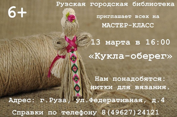 Рузская городская библиотека приглашает детей от 6 лет на мастер-класс «Кукла-оберег». Он состоится 13 марта в 16 часов.